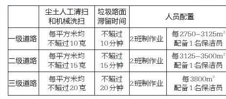 標準提到,西安市道路清掃保潔等級劃分為一級、二級、三級道路。道路清掃保潔質量應達到“道牙無塵,路無雜物,設施整潔,路見本色”的質量標準。鐘鼓樓廣場、東南西北大街、省委周邊道路、大雁塔廣場和周邊道路、新城廣場周邊道路、張家堡廣場和周邊道路等重點區(qū)域地面塵土,人工清掃每平方米不超過5克,垃圾路面滯留時間不超過5分鐘;保潔員人員配備上,上述重點地區(qū)按三班制作業(yè),每2750平方米配備一名保潔員(一、二、三級道路作業(yè)標準見表格)。